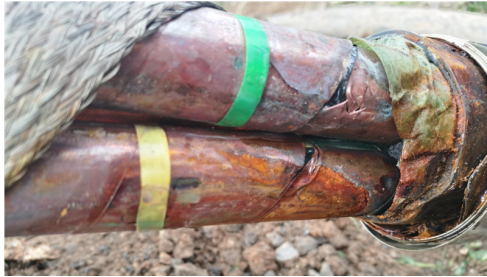 周期放電去聲磁定位,剛開始還能聽到聲音,在精確定位時(shí)發(fā)現(xiàn)聽不到聲音了,判斷為故障點(diǎn)燒穿,成為低阻故障,所以聲音減小,現(xiàn)場(chǎng)人員告知此處有一接頭,停止放電挖出接頭后發(fā)現(xiàn)接頭外觀完好,反復(fù)搖晃電纜接頭,繼續(xù)打壓,在接頭處聽到微弱放電聲,打開接頭后發(fā)現(xiàn)接頭進(jìn)水。